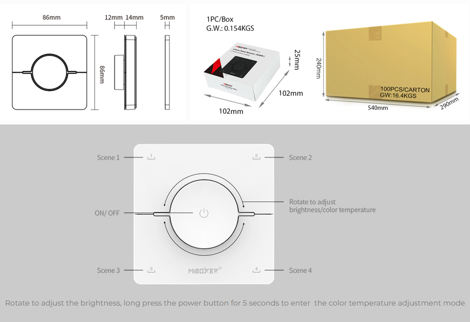 Tento dálkový ovladač je kompatibilní s určenými lampami Mi-Light a MiBoxer pracujícími na frekvenci 2,4 GHz. Umožňuje plynulé nastavení jasu a teploty barev osvětlení podle vašich preferencí.