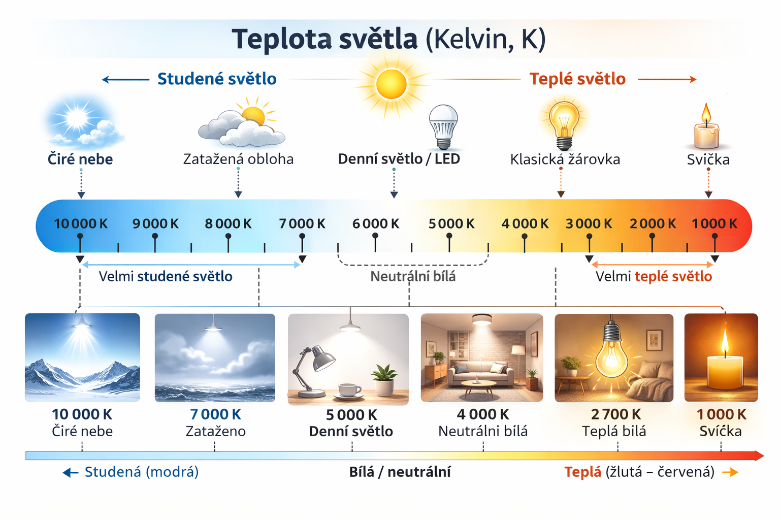Různé barvy světla vycházejí z teploty chromatičnosti měřené v kelvinech a přímo ovlivňují, jaké osvětlení se hodí do konkrétního interiéru. Moderní LED osvětlení, LED žárovky a LED pásky umožňují volit barevnou teplotu i intenzitu světla podle funkce zóny. Při návrhu vyhodnocujeme nejen barvu světla, ale i parametry světelných zdrojů. Díky přesně definované teplotě barvy a stabilnímu bílému světlu z LED diody dokážeme kompenzovat nedostatek přirozeného denního světla a sladit různá svítidla do harmonického celku.
