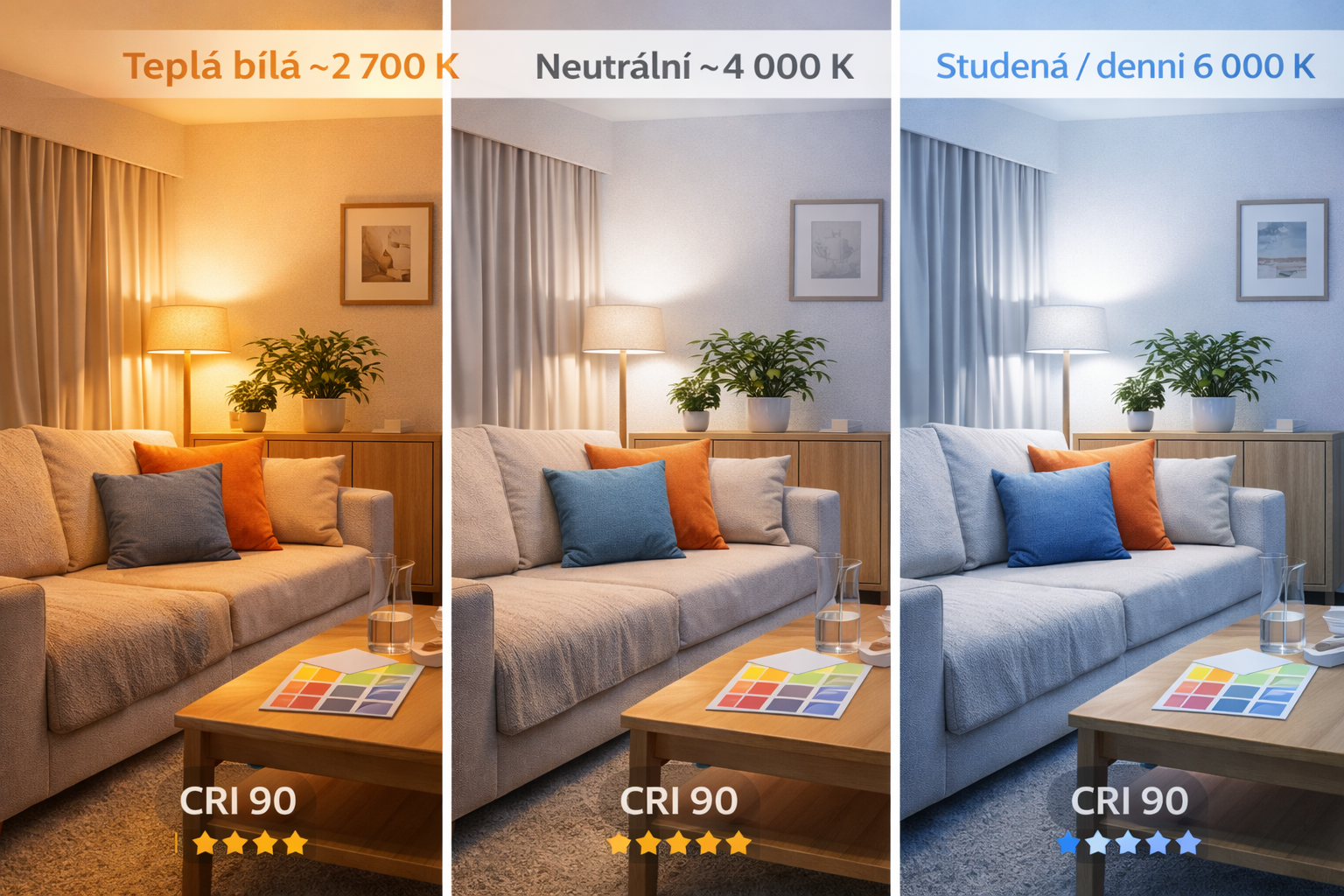 Pro obývací pokoj se často doporučuje teplejší až neutrální světlo kolem 2700–3500 K, protože podporuje relaxaci a zvýrazní tóny pastelových barev a interiérové materiály v osvětlení obývacího pokoje. Pokud preferujete moderní, chladnější vzhled, lze zvolit světlo blíže 4000 K, ale pozor na to, jak ovlivní vzhled nábytku a textilií.