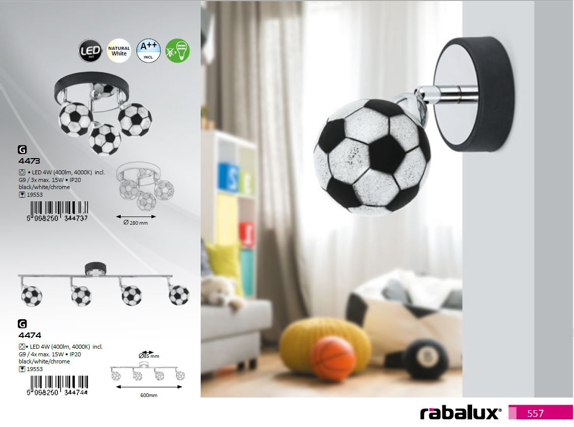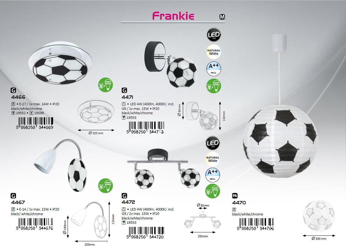 Nástěnné svítidlo Frankie se skleněným stínidlem ve vzhledu fotbalového míče. Toto svítidlo je vhodné do dětských pokojů, potěsí každého malého fotbalistu. Rozměry jsou: výška 160mm, průměr 80mm. Součástí balení je i žárovka v neutrální bílé barvě světla.