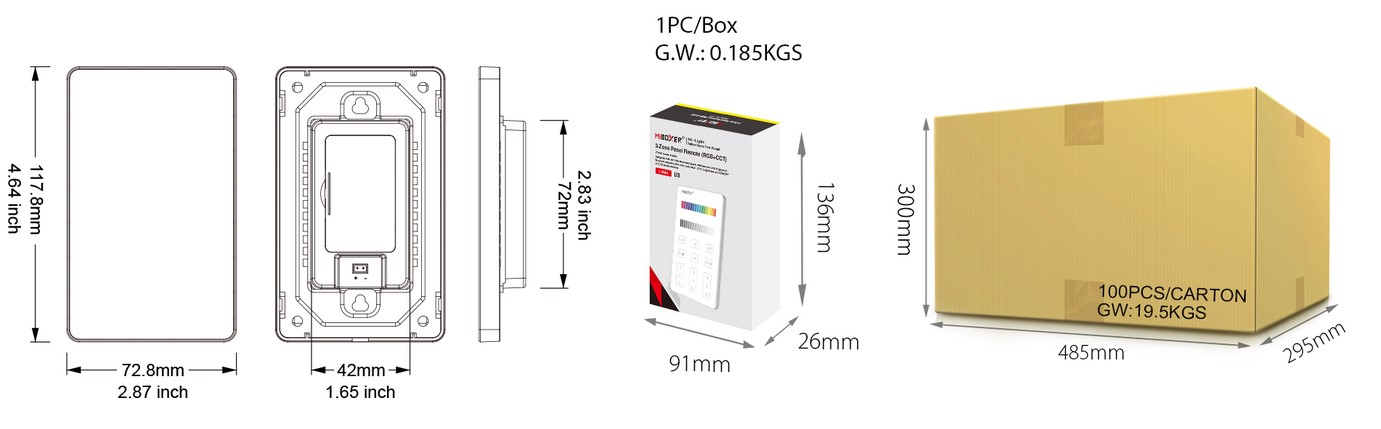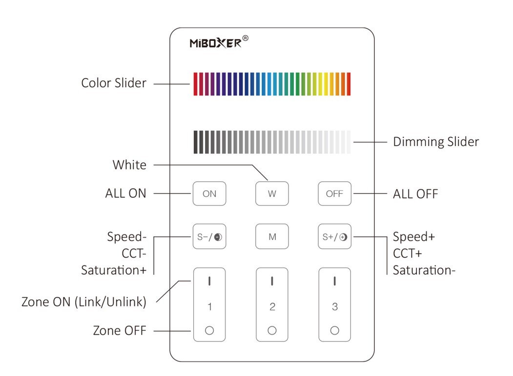 Dálkový ovladač je určen pro regulaci jasu, ovládání teploty barev, RGB, sytosti. Technologie bezdrátového přenosu 2,4 GHz.