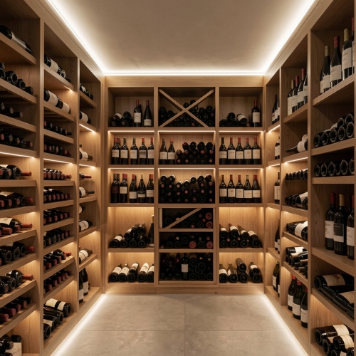 Hlavní osvětlení je páteří celého sklepa. Musí zajistit dostatečný světelný tok pro bezpečný pohyb, manipulaci s lahvemi i případnou práci v prostoru. Zároveň by ale nemělo být agresivní nebo studené – vinný sklep je místo, které si říká o příjemnou atmosféru.
