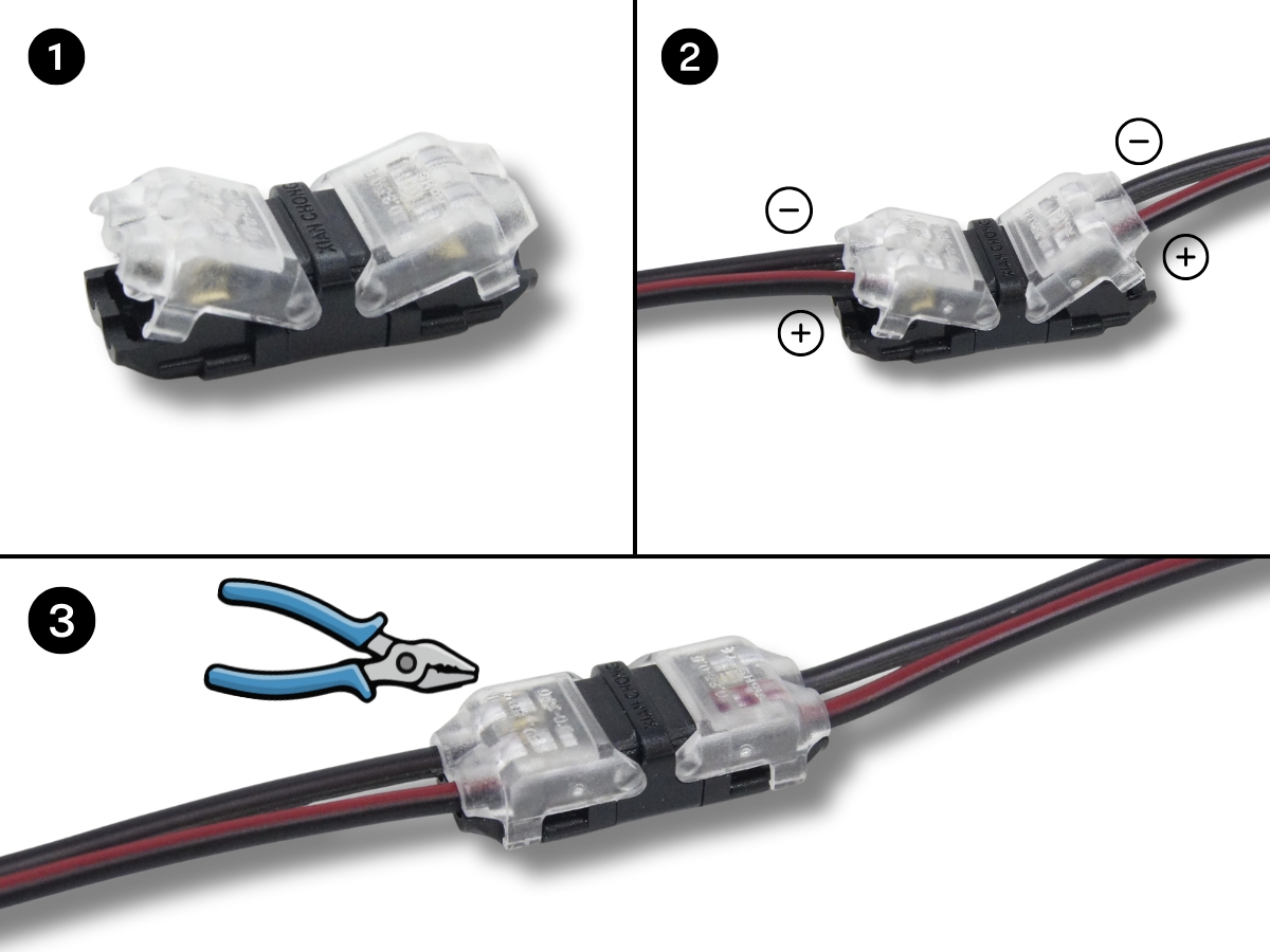 Instalace konektoru probíhá bez nutnosti odizolování konců kabelů. Kabely se vkládají přímo s izolací do konektoru. Pro uzavření a zajištění krytu konektoru se používají kombinované kleště, kterými se provede zamáčknutí.