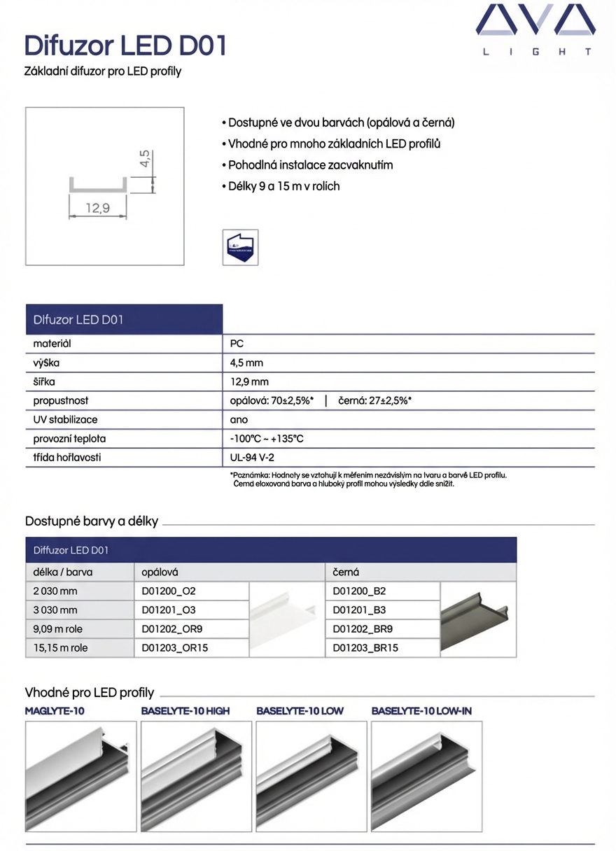 Černý difuzor je vyroben z UV stabilního polykarbonátu a chrání LED pásek před prachem i mechanickým poškozením. Click-in systém umožňuje rychlou a přesnou instalaci do LED profilu.