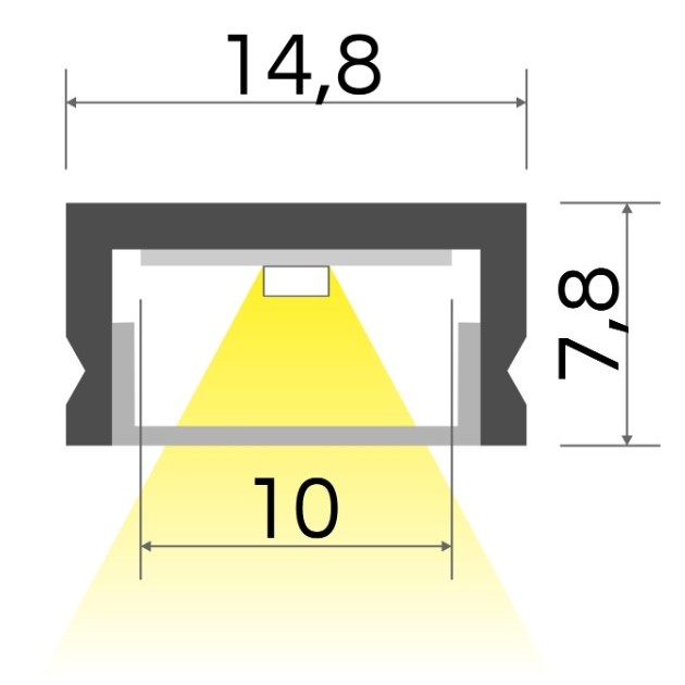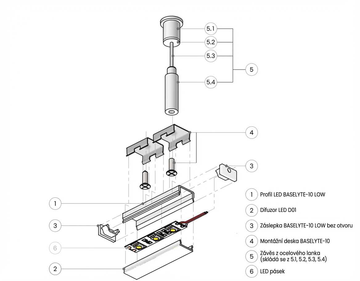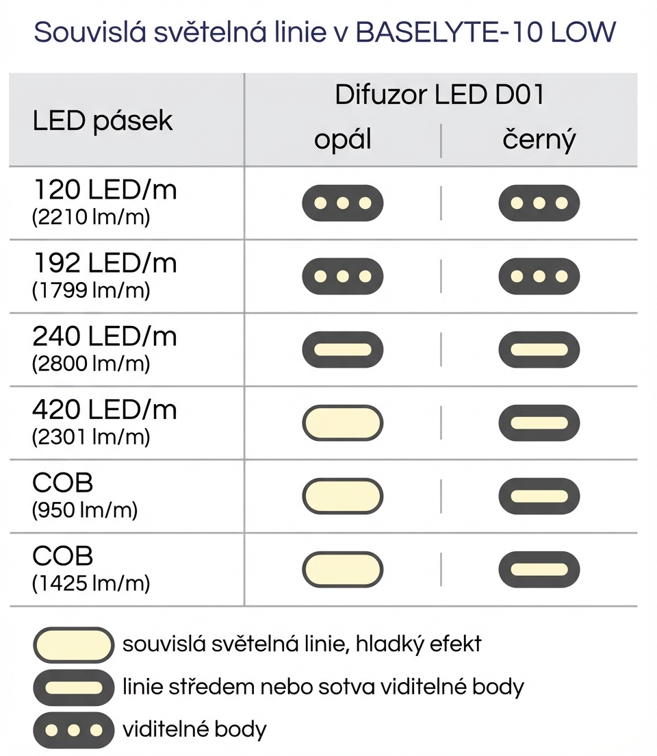 Hliníková lišta BASELYTE-10 LOW s krycím difuzorem je dimenzována pro LED pásky s minimální hustotou 420 LED čipů na metr. Tato specifikace zajišťuje dokonale rovnoměrné světlo bez vnímání jednotlivých světelných bodů. V případě použití LED pásků s menším počtem čipů na metr se mohou světelné body projevit, což je nejvíce patrné při černém difuzoru.