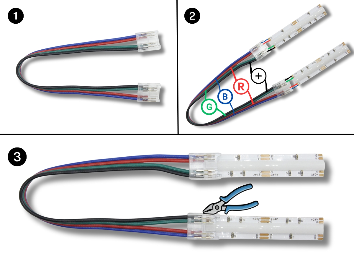 Jednorázový spojovací konektor pro 10 mm RGB COB LED pásky s jednoduchým uchycením pomocí kleští. Rozměry 11×13 mm, délka s kabelem 177 mm, zatížení až 6A. Vhodný pro domácí použití.