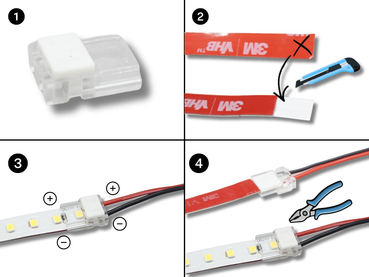 Před montáží sejměte samolepicí fólii i případné zbytky lepidla z oblasti, kam bude konektor připevněn. Poté LED pásek včetně kabelů správně vložte dle návodu a mechanicky uzavřete zaklapnutím.
