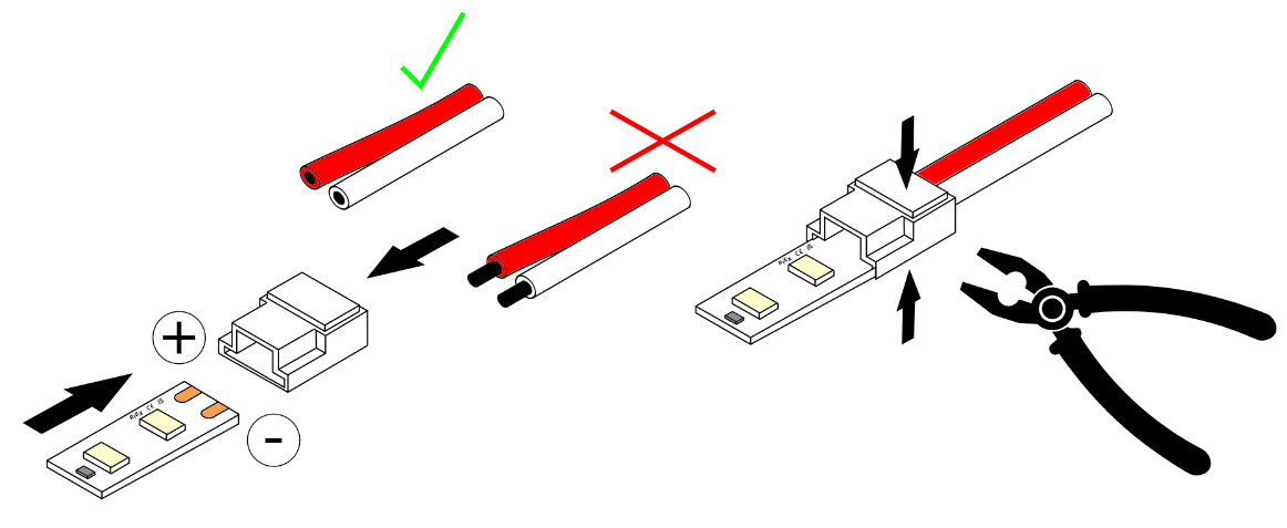 Balení neobsahuje napájecí vodiče. Kablíky koupíte v bílé barvě tady a v černo rudé tady. Pro zapojení používejte neodizolované kabely. Tato spojka je kompatibilní s jednobarevnými LED pásky s hustotou do 120 LED/metr.