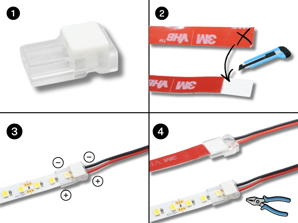 Před instalací odstraňte samolepicí vrstvu i zbytky lepidla z místa, kde bude spojka nasazena. Následně LED pásek společně s vodiči správně umístěte podle přiloženého schématu a mechanicky zajistěte zacvaknutím.