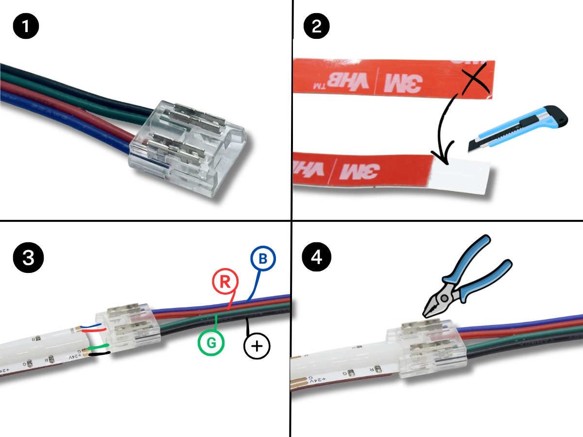 Praktická přípojka s kabelem pro 10 mm RGB COB LED pásky s jednoduchým zacvaknutím pomocí kleští. Maximální zatížení 4A, rozměry 11 x 13 mm. Vhodná pro domácí použití a rychlou instalaci bez pájení.