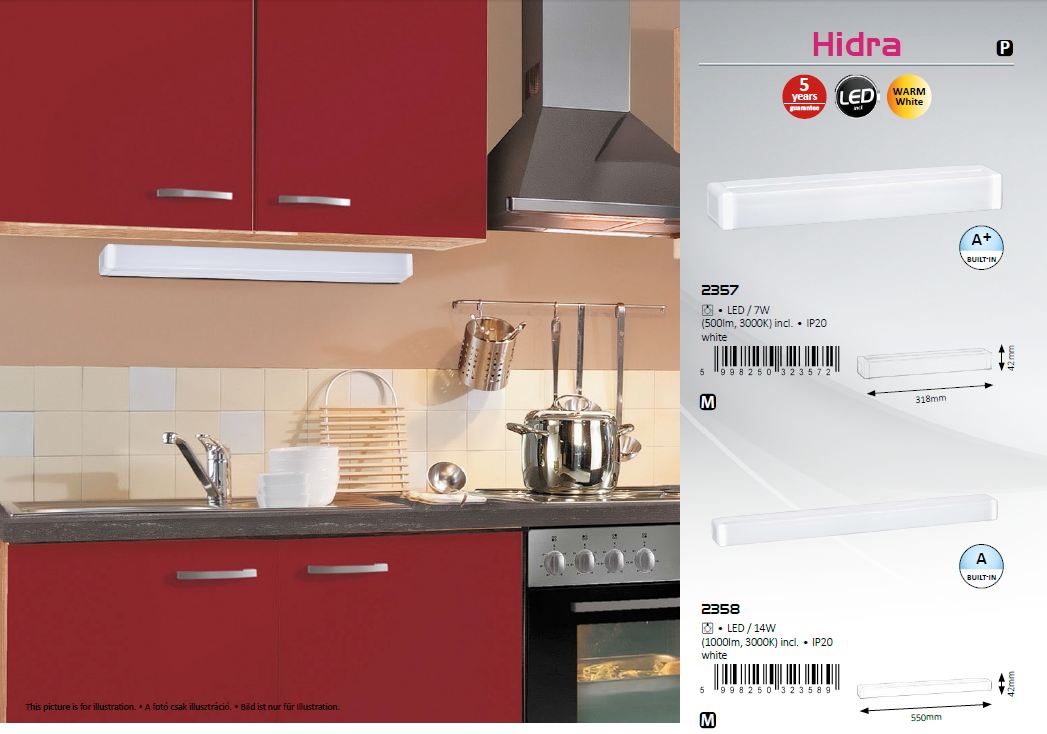 Nástěnné LED svítidlo Hidra je vhodné k osvětlení kuchyňské linky. Obsahuje úsporný LED zdroj 14W, vyrobeno z kovu a plastu. S krytím IP20. Rozměry jsou: šířka 550mm, výška 42 mm.