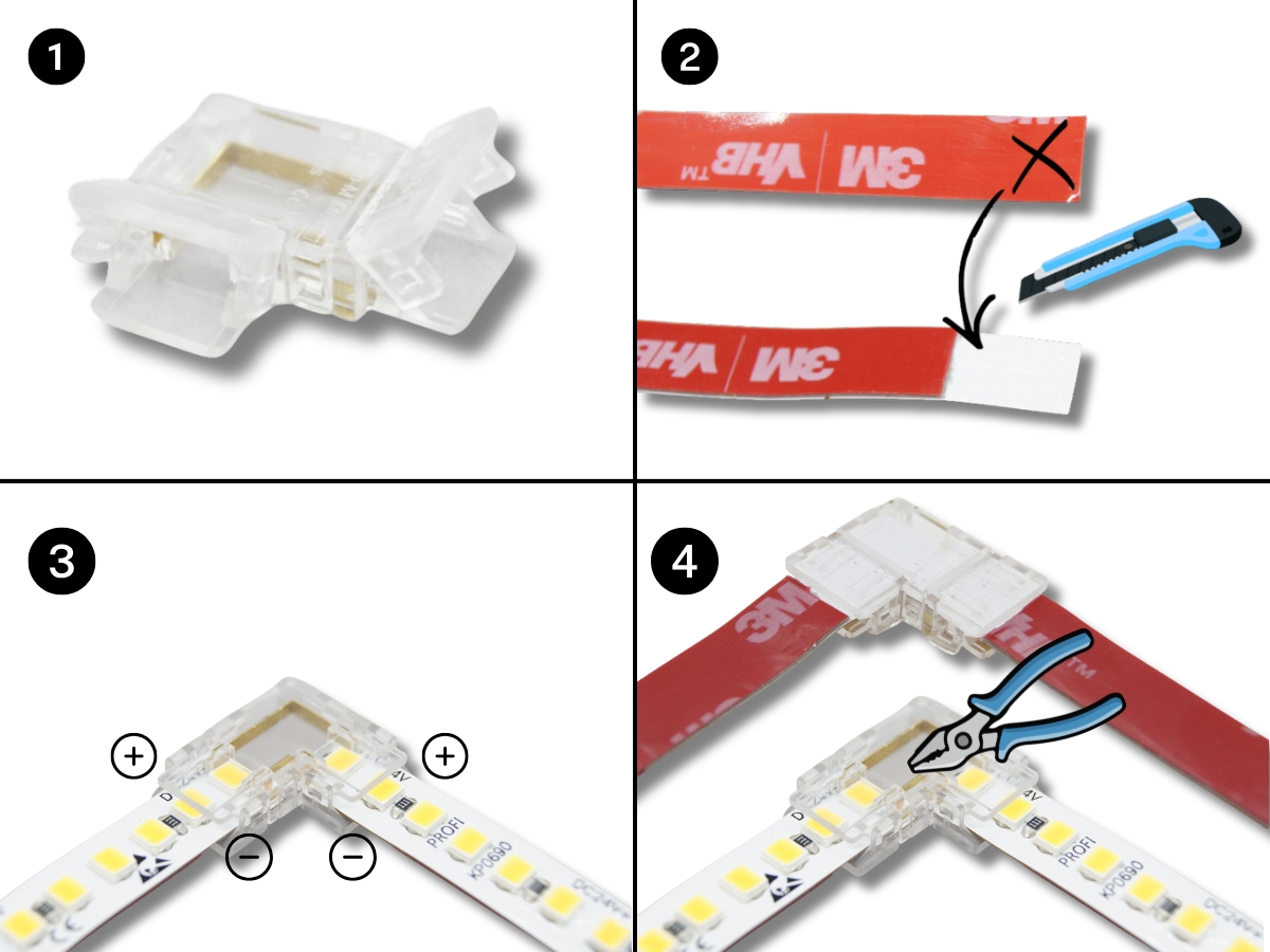 Konektor je kompatibilní s LED pásky s hustotou do 120 LED čipů na metr. Freecut pásky (pásky, které lze stříhat kdekoliv) lze zasunout až úplně do rohu spojky, u ostatních typů pásků je nutné dbát na správné umístění střihacího bodu.