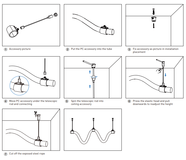 1 ks 1,5m sestaveného ocelového lana (včetně kulaté PC trubky 30 mm + 30mm PC klipů + 2 ks měděných šroubů)