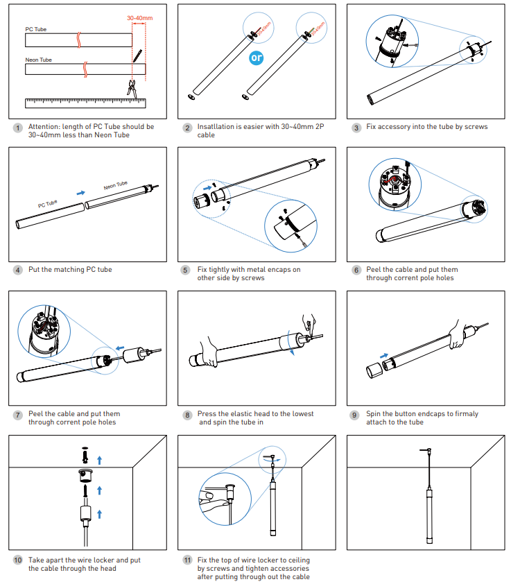 Kompletní montážní sestava zajišťuje instalaci neonového osvětlení. LED neonová tuba není přibalena a musí se pořídit odděleně.