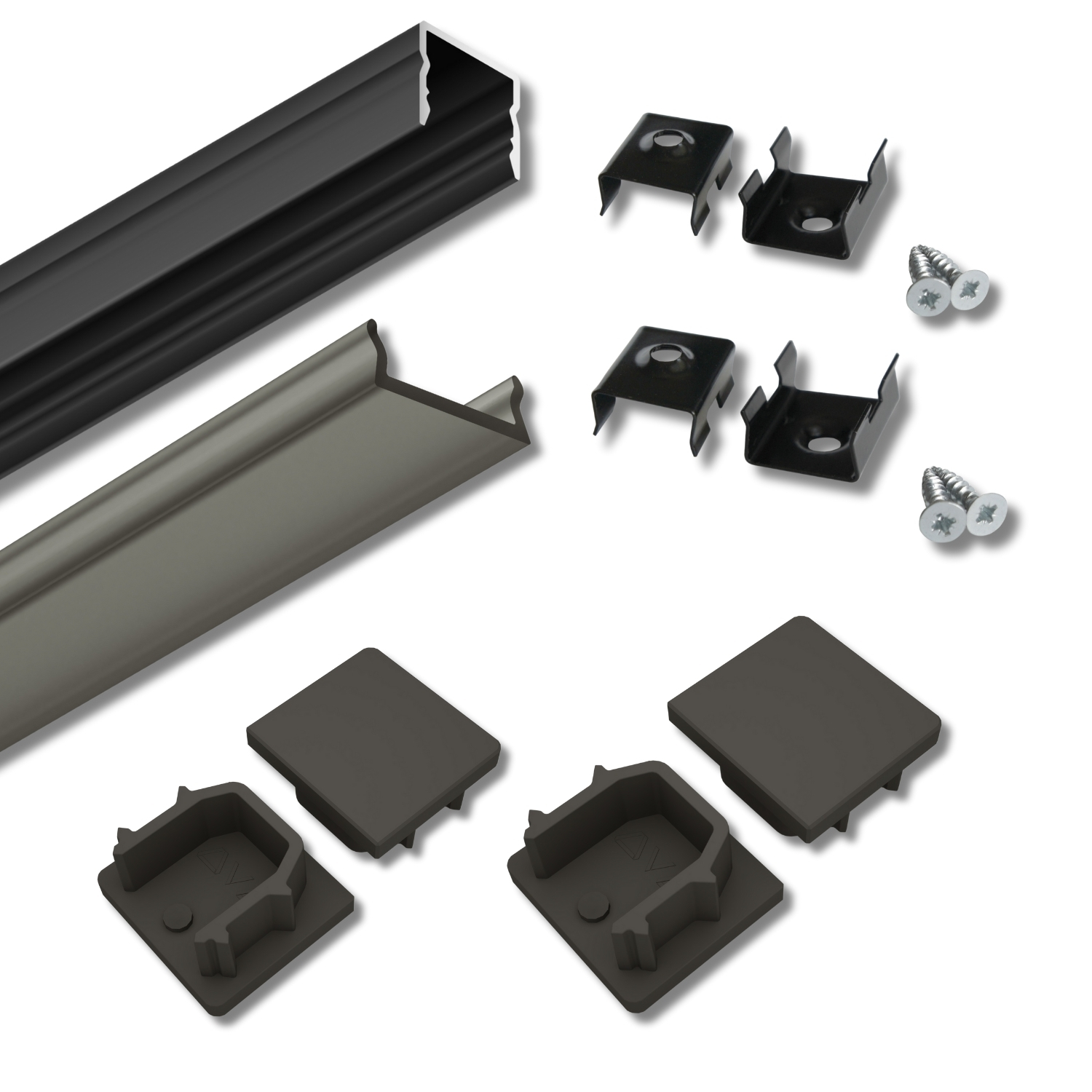 Součástí setu jsou plné koncovky, které zajistí čisté a estetické zakončení profilu, a montážní úchyty se šrouby, umožňující pevné a stabilní uchycení na stěnu či strop.
