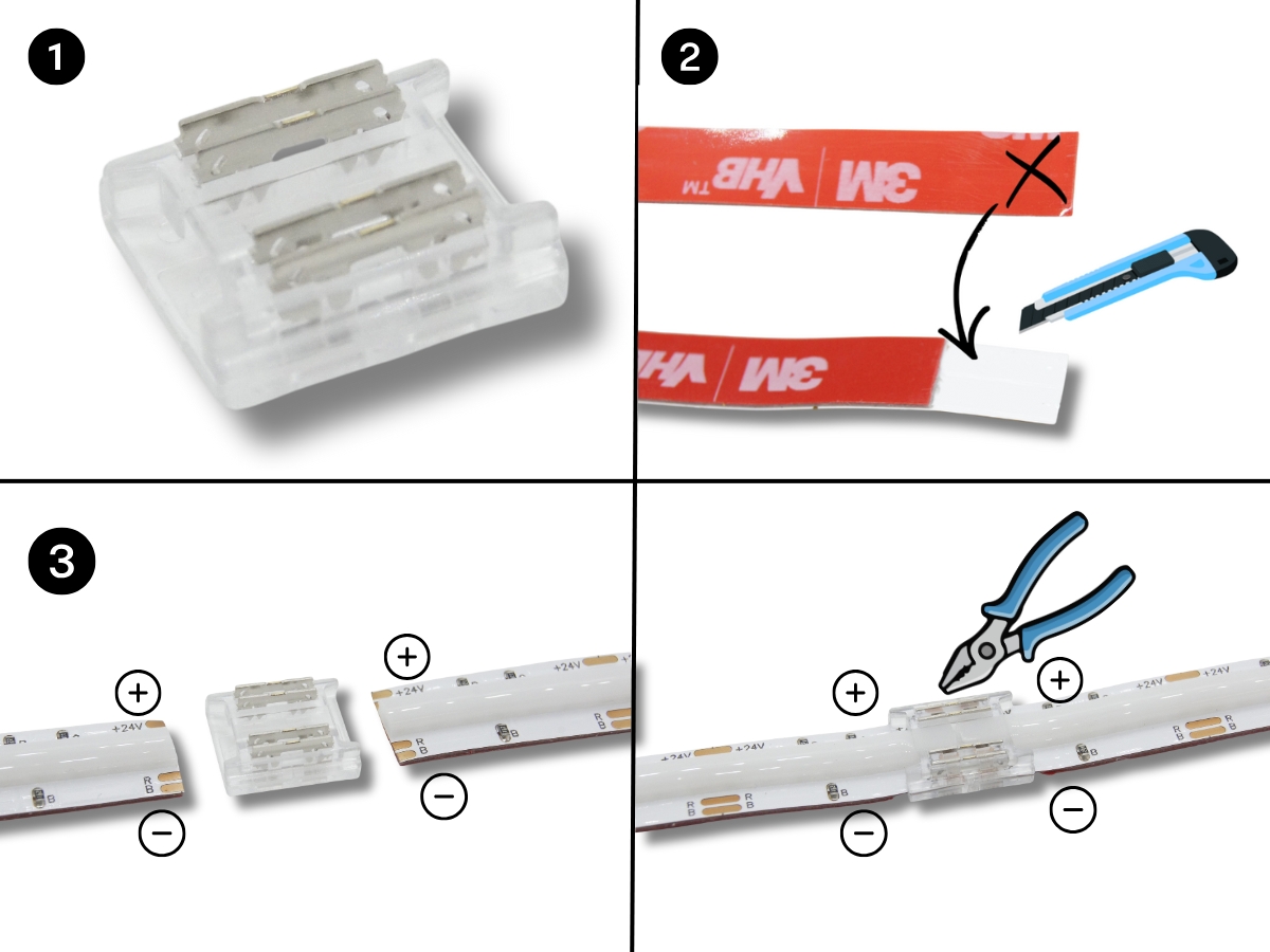 Konektor je navržen pro RGB LED pásky o šířce 10 mm a hodí se především do domácího prostředí. Montáž se provádí zatlačením kontaktních jehel do pásku za pomoci kleští. Jedná se o jednorázový spojovací prvek s rozměry 11x13 mm a maximální proudovou zatížitelností 6A. Před zasunutím LED pásků do spojky je potřeba odstranit lepící pásku včetně lepidla, pak lze LED pásky nasunout a následně zacvaknout pomocí kleští.