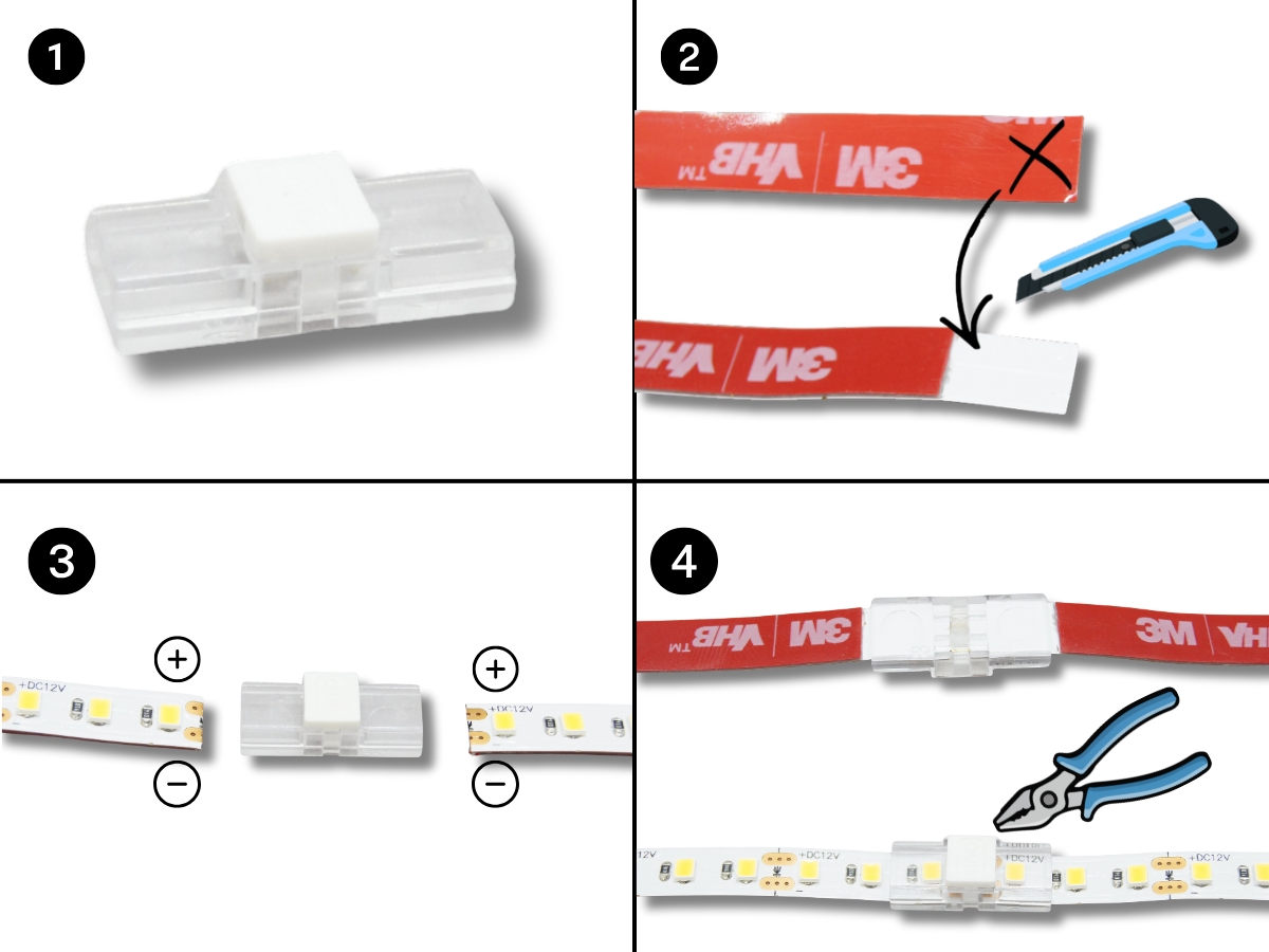 Před montáží je nutné ze zadní strany LED pásku odstranit samolepicí pásku včetně lepidla v místě, které bude zasunuto do spojky. Následně LED pásky vložíte do konektoru a poté kleštěmi stlačíte kovové kontakty, které proniknou do vodivých cest.