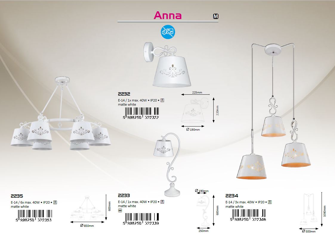 Stolní lampa Anna s paticí E14 v provedení s přepínačem. Lampa Anna je v romantickém stylu v bílé barvě. Materiál lampy je kov. Žárovka není součástí balení, je možno použít energeticky úsporné žárovky.