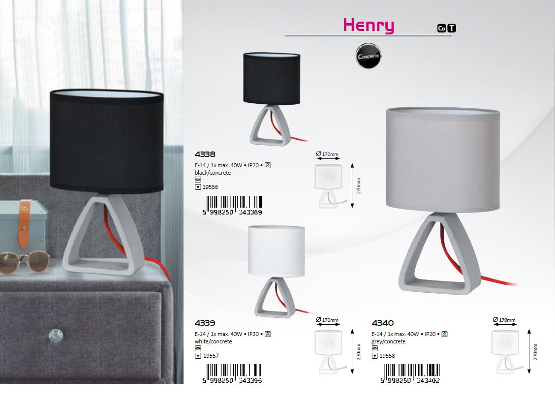 Stolní lampa Henry je industriální lampa vhodná jako doplňkové osvětlení do interiéru. Lampa je betonová s textilním stínidlem . Patice E14. Rozměry jsou: výška 270 mm, šířka 170 mm s kabelovým spínačem.